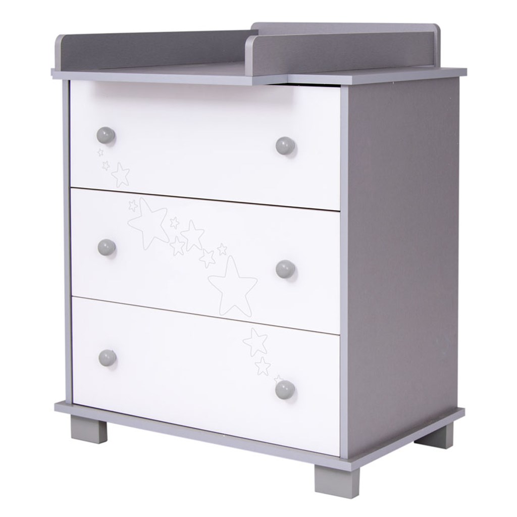 Štýlová komoda s tromi objemnými šuplíkmi s obrázkom trblietavých hviezdičiek. Komoda je vybavená odnímateľným prebaľovacím pultom. Rozmery: cca 90x83x48cm.