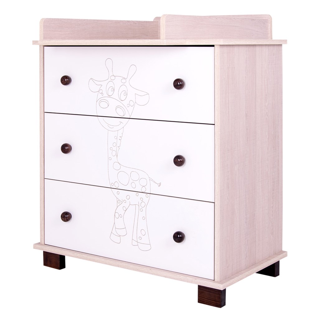 Štýlová komoda s tromi objemnými šuplíkmi s obrázkom žirafy. Komoda je vybavená odnímateľným prebaľovacím pultom. Rozmery: cca 90x83x48cm.
